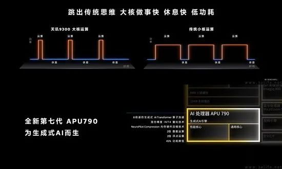 联发科的天玑9300同样在这一方面也迎来了大幅提升,其APU 790的整数和浮点性能较前代提升2倍,与vivo合作已适配最高330亿的大语言模型。并且针对目前AI相关应用较少的市场现状,还额外准备了APU与其他模块的联动,包括视频优化、视频AI景深画质引擎等。但这些很容易就会被认为是其他模组的升级中,导致用户产生新款SoC在“挤牙膏”,对体验提升不明显的误解。