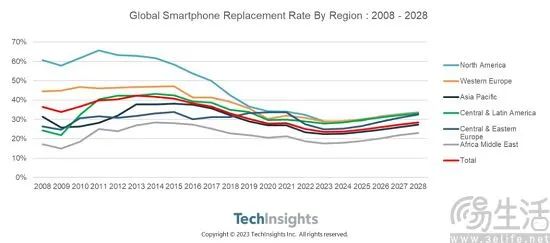 调研机构TechInsights日前公布的相关数据显示,2023年全球智能手机换机率可能会跌至23.5%(换机周期51个月)的最低点,从2024年开始则将缓慢反弹。对此有观点认为,这是旗舰手机性能过剩所导致,并认为目前诸如《王者荣耀》、《和平精英》等游戏,即使是配备较老款旗舰SoC的机型也能实现高帧率流畅运行,因此新款旗舰SoC给用户带来更多的实际体验改善并不大。