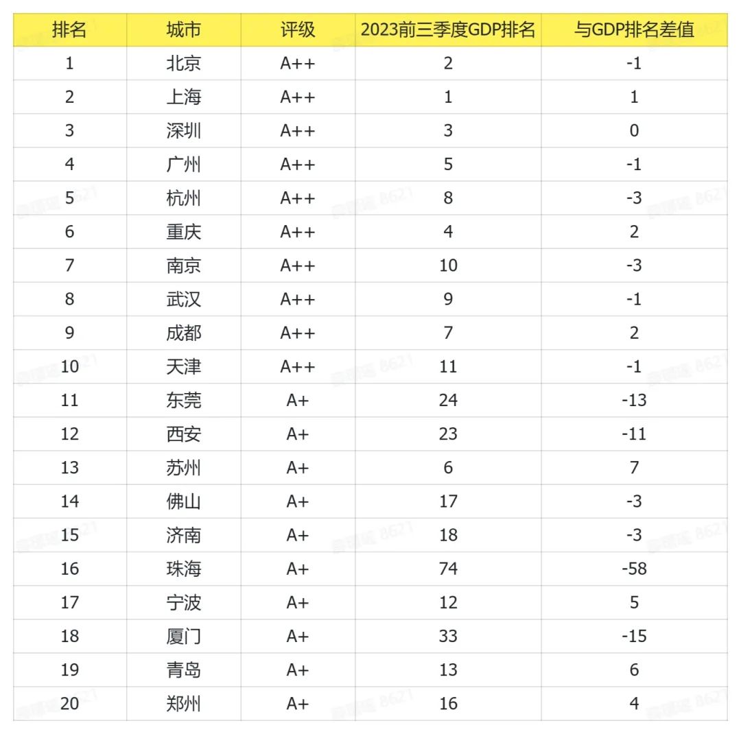 我们重点关注前20名的表现。在前10名中,等级为A++,表现出色且稳定。接下来的11-20名等级为A+,同样非常优秀。然而,11-20名之间经常会有较大的排名变化,这是由于不同排行榜之间的差异所致。至于排名20名以外的城市,它们的重要性相对较低,因此我们主要关注前20名的表现。