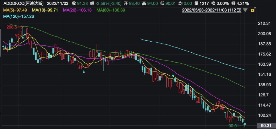 2022年10月,阿迪达斯宣布彻底结束与Kanye West(侃爷)长达9年的的合作,旗下曾经最热门的YEEZY系列也随之停止生产,这次合作的终止也使阿迪达斯产生了大量的库存堆积,造成了约6亿欧元的库存损失,2022年11月3日阿迪达斯股价跌至90欧元。