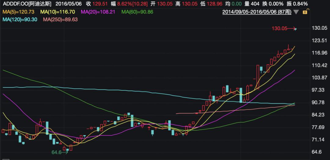 阿迪达斯2016年第一季度销售收入增长22%,毛利提高49.4%,股价攀升至130欧元,自2014年以来首次追平耐克。