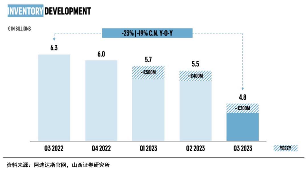 2023年6月,YEEZY系列被重新上架,诱发了消费者“买绝版”的心理。首批上架的YEEZY系列为阿迪达斯带来了约4亿欧元的收入,与2022年同期的销售额基本持平。根据2023年三季度报显示,截至9月份,阿迪达斯的库存水平下降了超过11亿欧元,与2022年的63.15亿欧元相比下降了23%。