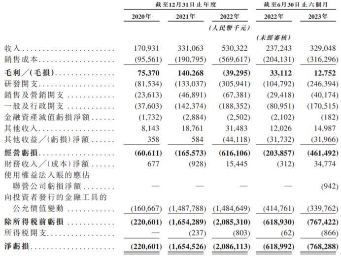 与此同时,营收也水涨船高。速腾聚创2020年、2021年、2022年和2023年上半年的营收分别约为1.71亿元、3.31亿元、5.30亿元和3.29亿元。但同时依然亏损,速腾聚创这三年半经调整净亏损分别约为0.60亿元、1.08亿元、5.63亿元和2.44亿元。
