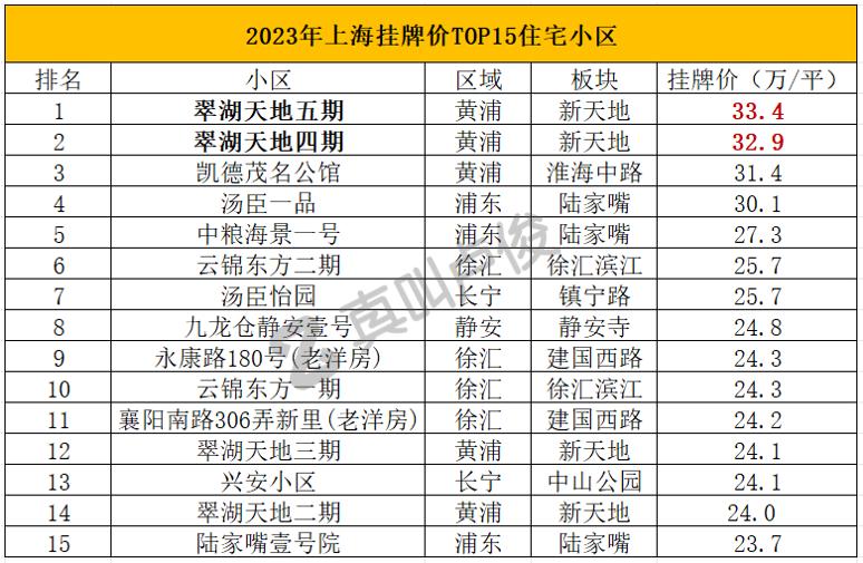 去年上海挂牌价最高的小区,来自于黄浦新天地的翠湖天地,目前挂牌价已经高于30w+/平。