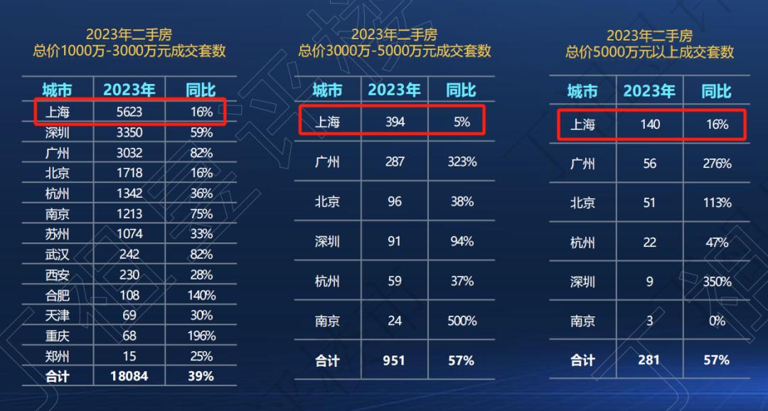 但从 成交量来看,2023年上海1000万-3000万,3000万-5000万,及5000万以上二手成交套数,均排名全国第一 , 遥遥领先于其他城市 。