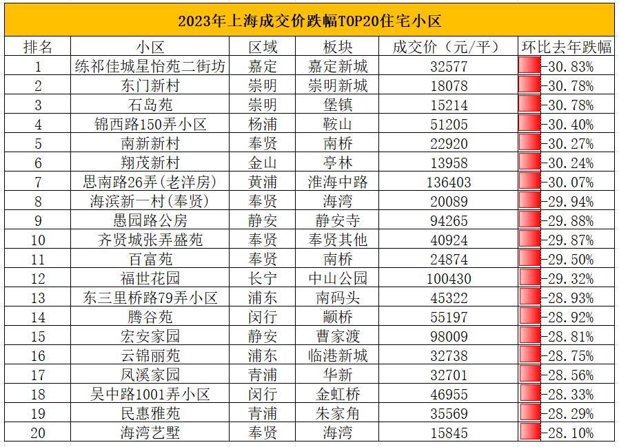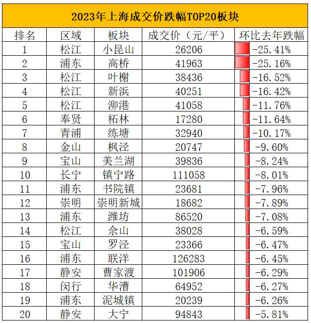 市区板块里,意外出现了长宁镇宁路和浦东联洋,不过跌幅并不大,都在10%以内 。