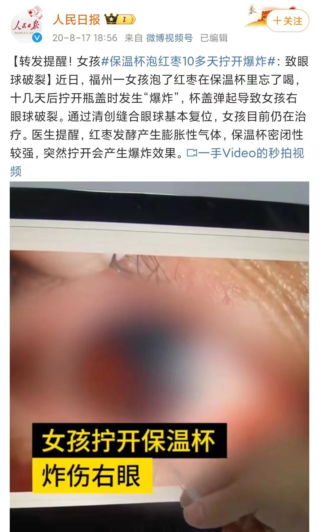 2020年,福州一个女孩,保温杯里泡红枣泡了十几天,拧开瓶盖时,杯盖骤然弹出,导致女孩右眼球破裂。