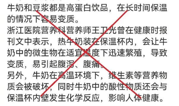 首先,虽然“微生物在适宜温度下迅速繁殖”原理上没有错,但关键“保温杯里的温度”和“微生物的适宜温度”是否一致。在食品安全规范中,60℃以上被认为“安全温度”,食物可以长时间保存。也就是说,如果牛奶和豆浆被加热到了60°C再装进保温杯,一天之内温度也下降不了多少,细菌也就不会长起来。而如果是常温牛奶,那么完全没有必要装进保温杯,直接保持原始包装,不开封的话就可以了。