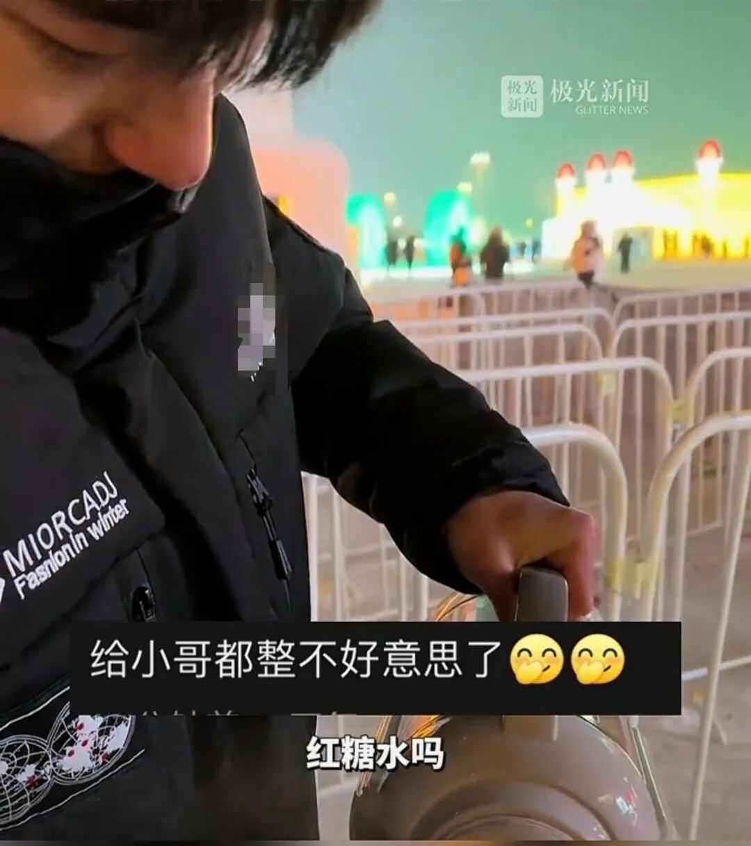 185男大“提溜”着装满热饮的暖壶,给排队的南方游客送温暖。