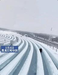 纵观整个东北,好像只有哈尔滨能给得起14条滑道、最长 521米的冰雪滑 梯。