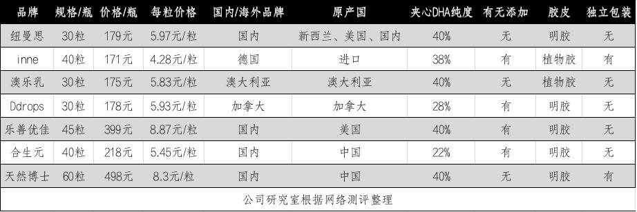 国内市场上,每粒DHA补剂均价与纽曼思相近的品牌有澳乐乳、合生元、Ddrops、inne等,均价明显高于纽曼思的品牌有天然博士、乐善优佳。