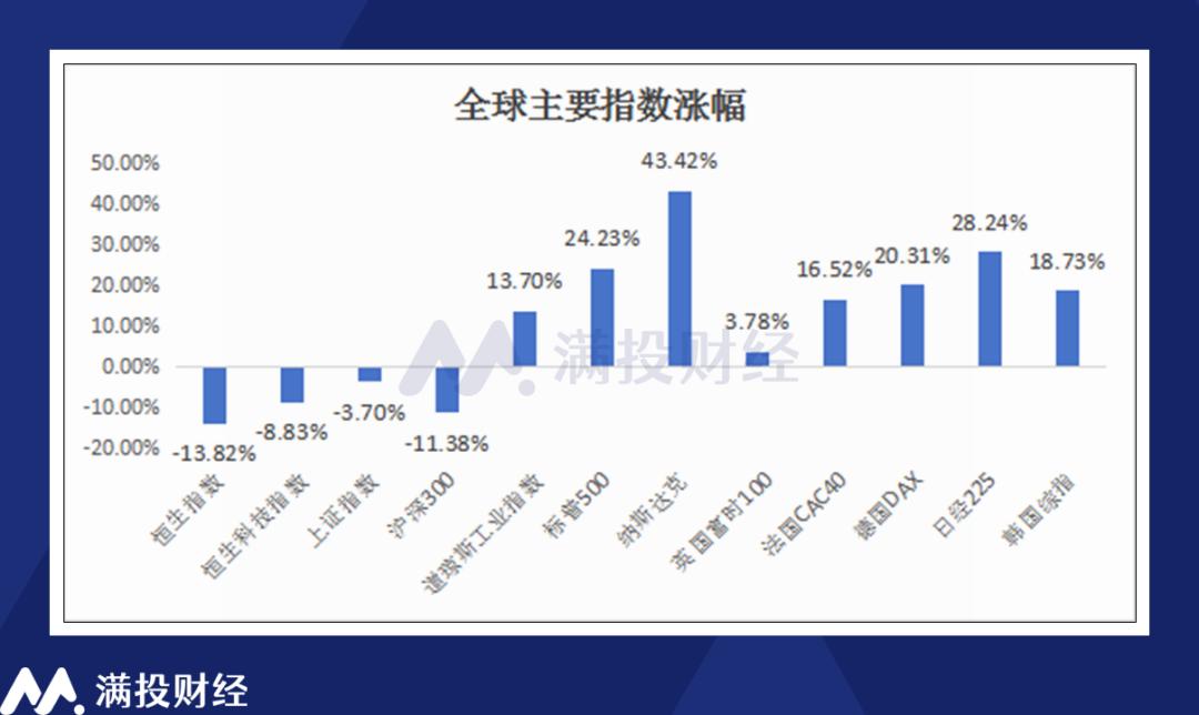 截至2023年12月31日,恒生指数年内下跌13.82%、恒生科技指数下跌 8.83%。同期,A 股市场,上证指数下跌3.70%、沪深300下跌11.38%;美股市场,道琼斯工业指数上涨13.70%、标普500 指数上涨 24.23%、纳斯达克指数大涨43.42%。2023 年,在全球主要股市中,港股市场表现靠后。