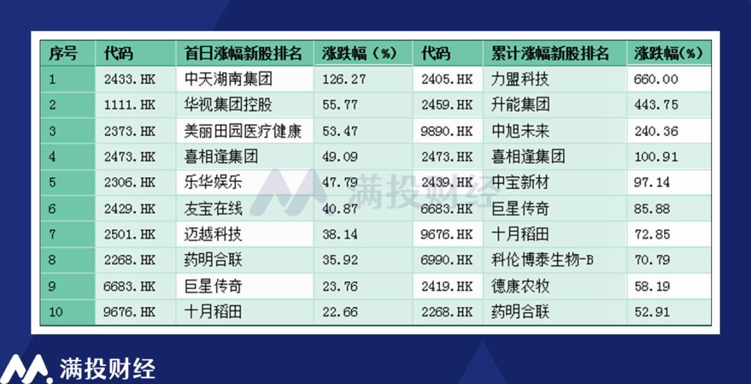 上市首日表现最好的是中天湖南集团(2433.HK),录得涨幅126%,其次是华视集团控股(1111.HK)和美丽田园医疗健康(2373.HK);累计涨幅表现最好的是力盟科技(2405.HK),累计涨幅达到660%,升能集团(2459.HK)和中旭未来(9890.HK)也录得444%和240%的涨幅。