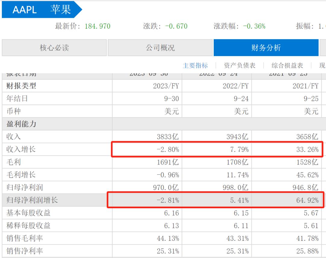 苹果近三年年度财报显示,2021年营收3658亿美元,同比增长33.26%。归母净利润946.8亿美元,同比增长64.92%。两项增幅均创下近十年增幅之最。但在2022年,苹果增速骤降,营收3943亿美元,同比增幅7.79%。归母净利润998亿美元,增幅为5.41%。2022年好歹还是正增长,2023财年营收和归母净利润均实现了负增长,其中营收3833亿美元,下滑了2.8%,归母净利润为970亿美元,下滑了2.81%。