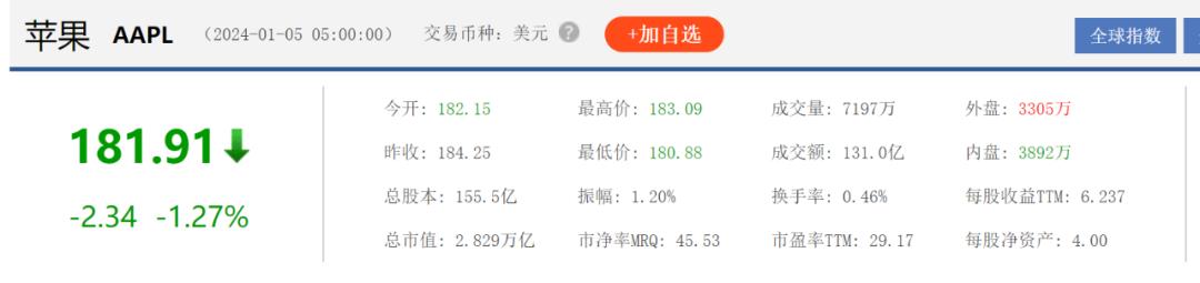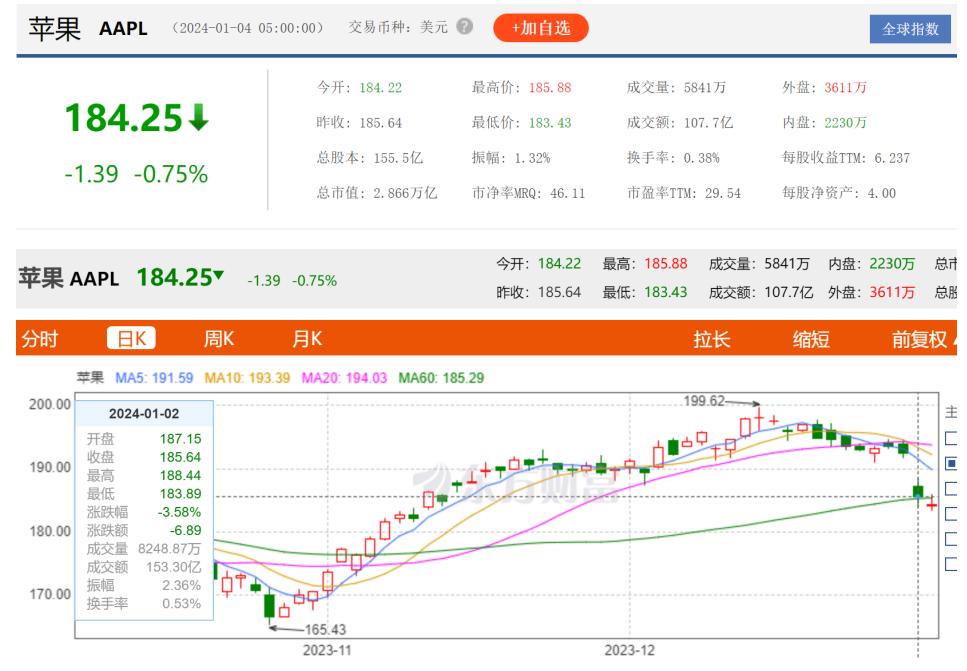 1月3日,苹果收盘股价为184.25美元,下跌0.75%,1月4日持续下跌1.27%,加上此前1月2日,跌幅3.58%,单日市值蒸发1071美元,此后三天股价连续下挫,总市值下跌了1864亿美元,以最新汇率计算约合人民币1.3万亿元。和2023年12月14日199.62美元的高点相比,市值蒸发2753亿美元,在不到一个月的时间内,巨无霸苹果已经蒸发了1.56万亿元。