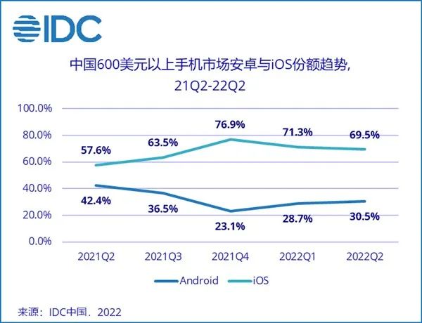 从苹果来看,根据IDC整理的中国600美元以上手机市场趋势图能看出,从2021 Q2开始,苹果iOS的份额就不断上涨,2021 Q4达到顶峰,直接霸占了70%以上的市场,到2022前两个季度,仍维持在70%左右。而根据今年IDC的报告,上半年中国高端手机市场品牌份额排行榜中,苹果市场份额降到67.0%,安卓份额开始回升至30%。