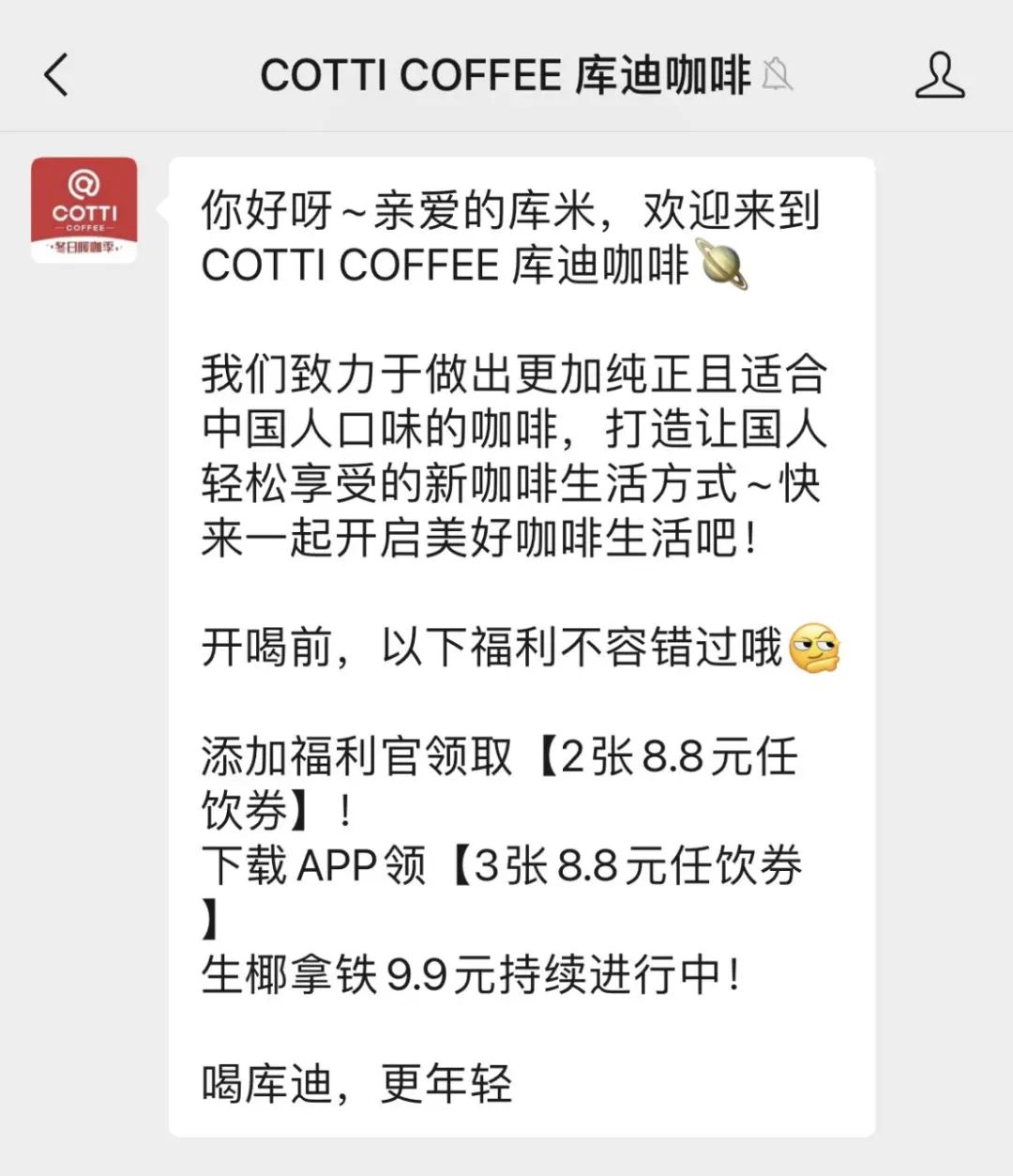 库迪门口的立牌显示,消费者下载APP后可以一次性领取3张库迪的8.8元任饮券,9.9元的生椰拿铁无门槛、不限量。