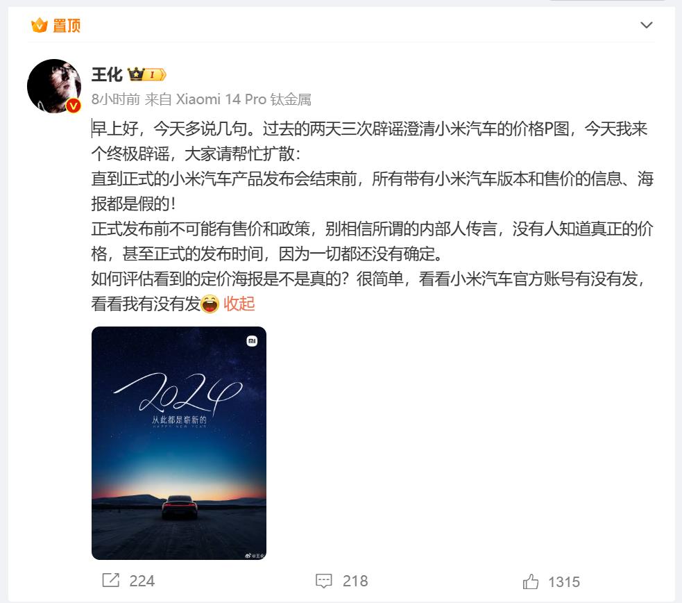 1月4日,王化又来了一次「终极辟谣」,为过去两天三次辟谣澄清做一个总结——直到正式的小米汽车发布会结束前,所有带有小米汽车版本和售价的信息、海报都是假的。