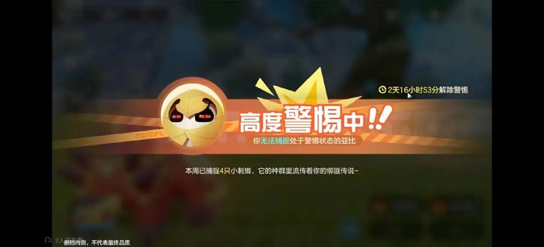 当然,游戏中大部分亚比还是能通过野外捕捉获得。但游戏为了控制玩家的游戏进度,防止玩家拉满单只亚比速通剧情,对亚比的捕捉数量做了严格的限制。同一亚比每周最多捕捉4只,数量达标后会以“种群对你产生警惕”的文字说明,强制中止玩家的捕捉行为,对传统的捉宠体验带来较大影响。