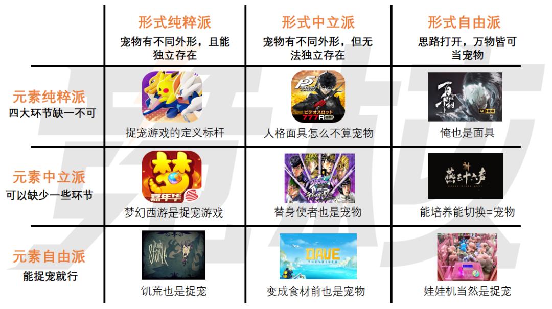 环节的简化以及玩法的轻量化,让捉宠只是游戏中一个重要性不高的子系统,这也使得它们距离捉宠游戏的定义更加遥远。至于九宫图的横轴,我们发现放松对宠物呈现形式的标准,会比放松元素标准,更容易偏离捉宠游戏的直感。