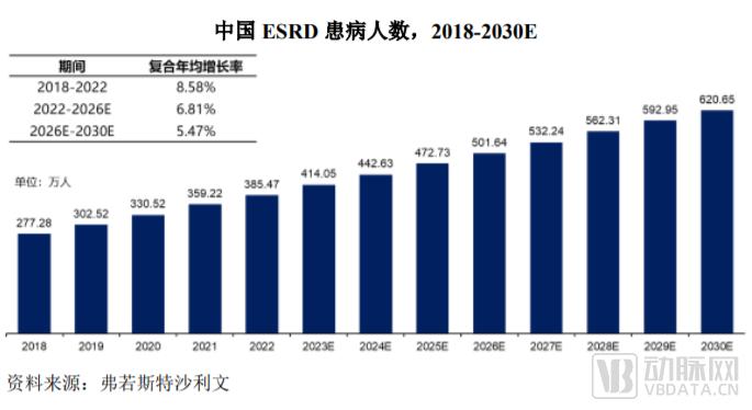 这得从多个维度来看,首先当然是患者体量,我国ESRD患者基数较大且增长较快。根据弗若斯特沙利文数据,2018年我国ESRD患者数量为277.28万人,占全球ESRD患者数量的30%以上。2018-2022年,我国ESRD患者数量从277.28万人增加到385.47万人,复合年均增长率为8.58%。预计到2026年,中国ESRD患者数量将增至501.64万人,2022-2026年的复合年均增长率为6.81%,高于同期全球患者增长速度。
