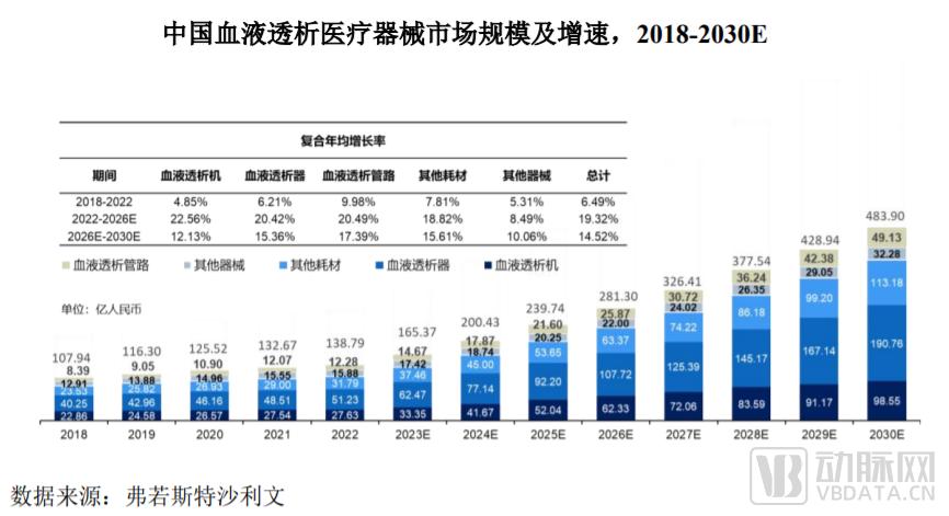 因此,根据弗若斯特沙利文数据,2018年至2022年,我国血液透析医疗器械市场规模复合年均增长率达到6.49%,预计至2030年将增加至483.9亿元。其中,2022年我国血液透析器的市场规模达到51.23亿元,为血液透析医疗器械市场中占比最高的细分领域。预计至2030年,血液透析器的市场规模将达到190.76亿元,而血液透析机的市场规模将达到98.55亿元。
