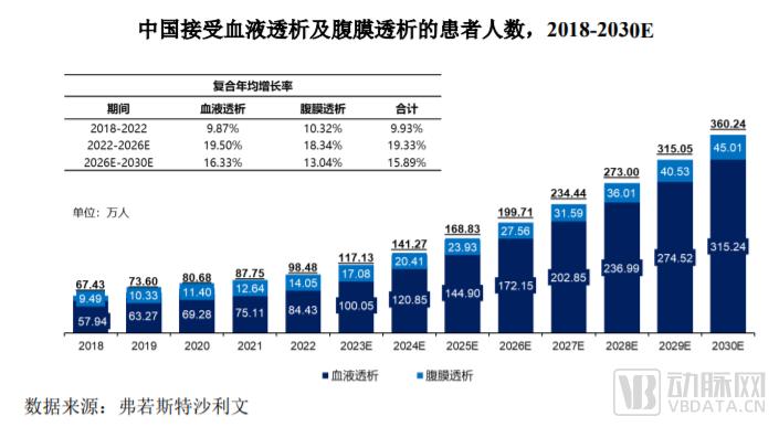 其次则是在市场渗透率上。根据弗若斯特沙利文数据,中国接受血液透析的ESRD患者数量从2018年的57.94万人增加到2022年的84.43万人,复合年均增长率为9.87%,预计至2030年接受血液透析患者数量将达到315.24万人;中国接受腹膜透析的 ESRD 患者数量从2018年的9.49万人增加到 2022年的14.05万人,复合年均增长率为10.32%,预计至2030年将进一步增加到45.01万人。