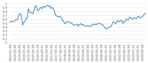 上一次小盘风格的最高点是在2016年10月的0.963,之后开始逆转,本轮小盘风格从21年1月开始,最高点是去年11月的0.741,目前回落到0.70的位置,没有达到上一轮最高点。