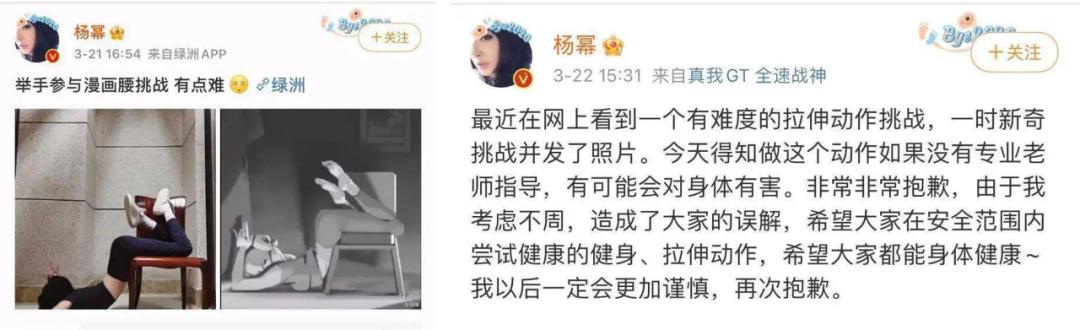 杨幂在微博晒过一张借助椅子完成的「漫画腰」动作,展现出姣好的身材。这个动作实则「腰椎过伸」,会增加腰椎肌肉拉伤的风险,许多训练者因为盲从却伤了腰。