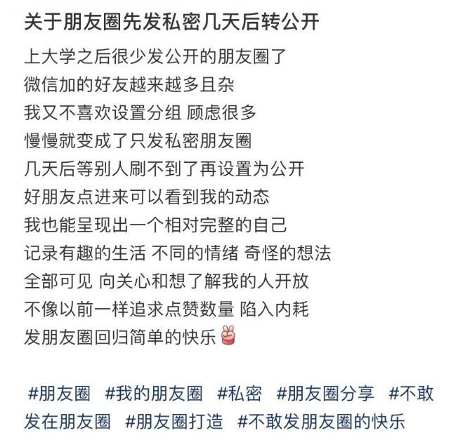 在这种矛盾之下,开始流行起了一种新的发朋友圈方式。先私密发送,过一段时间再公开。