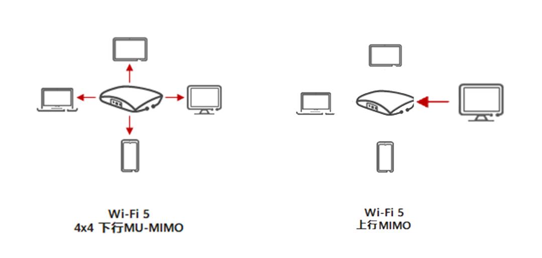 从 WiFi5 开始,路由器开始使用一种同时向多个设备发送数据的技术,叫做 DL MU-MIMO ( 下行多用户多路输入输出 ) 。