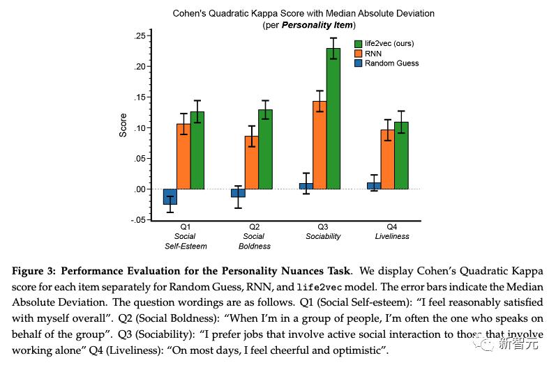 为了测试life2vec的多功能性,研究人员人员现在预测「个性细微差别」,这是测量光谱的另一端的结果,是个体内部的东西,通常可以通过问卷调查来衡量。