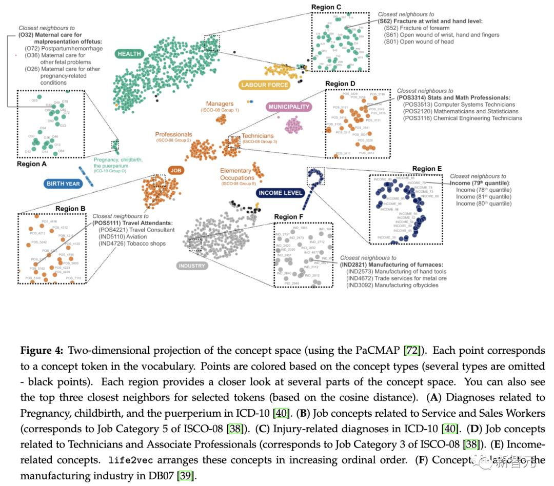 上图显示,将Life2vec应用于生命序列不仅允许研究人员预测早期死亡率,而且具有足够的通用性,足以捕捉个性的细微差别)。