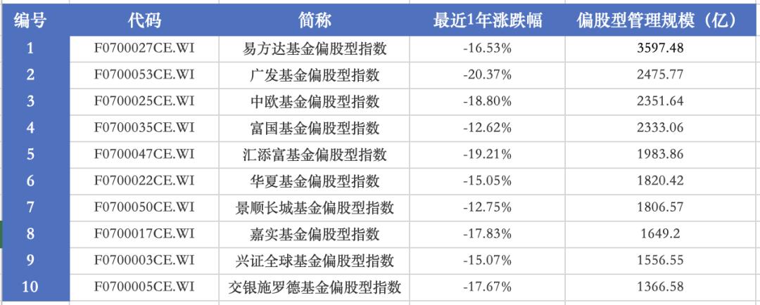 「市界」统计了市场上偏股型产品管理规模排名前10的基金公司,2023年1月3日至2024年1月3日,这10家公募“大厂”的偏股型产品指数跌幅均超过了两位数。