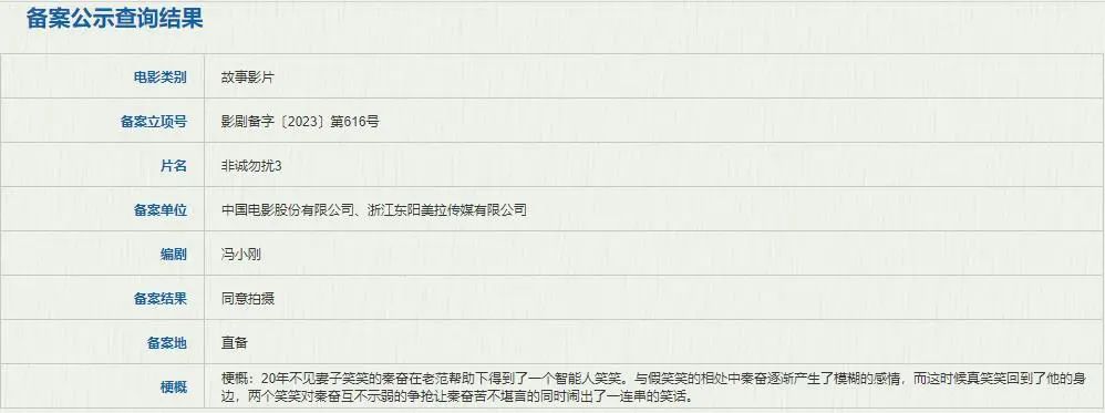 国家电影局备案公示查询结果显示,《非诚勿扰3》的备案单位有两家,分别是中国电影股份有限公司与浙江东阳美拉传媒有限公司,而出品方还包括中影创意(北京)电影有限公司、华谊兄弟电影有限公司、以及新疆博纳润泽文化传媒有限公司3家。