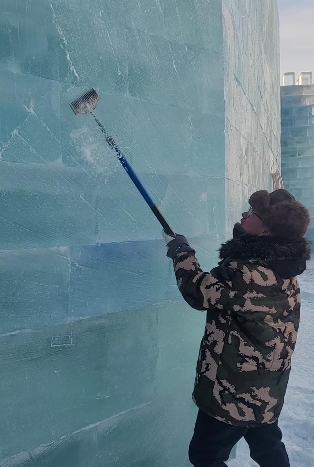 最近这段时间,他在冰雪大世界兼职做冰建,工作内容是修建大滑梯。