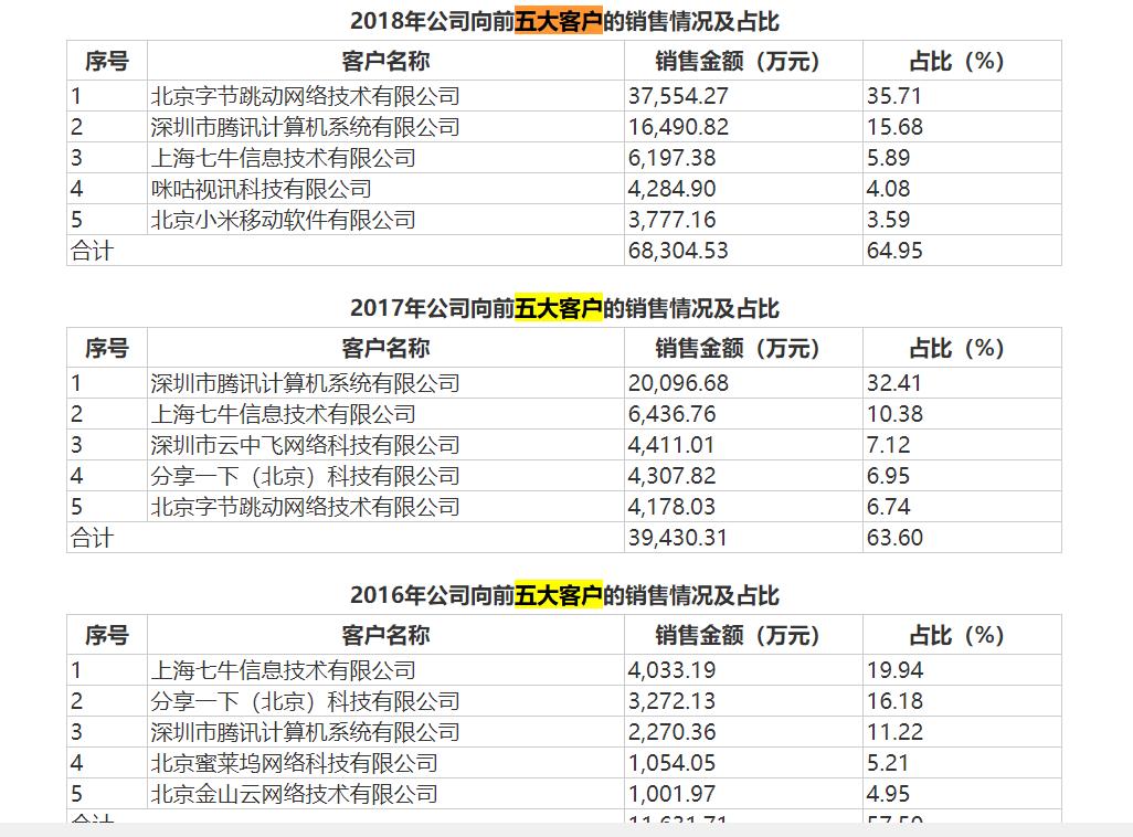 实际上,在贵州白山云披露的招股书中,公司的多位大客户来头不小。2016年-2018年期间,腾讯、小米、七牛云、咪咕视讯、金山云等知名企业均出现在公司五大客户的名单之中。