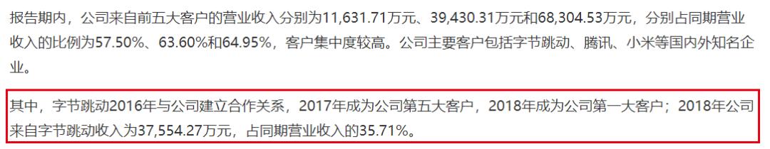 不过,贵州白山云曾经在递表上交所时披露,字节跳动与公司在2016年建立合作关系,2017年成为公司第五大客户,2018年成为公司第一大客户。2018年,公司来自字节跳动收入为3.76亿元,占同期营业收入的35.71%。