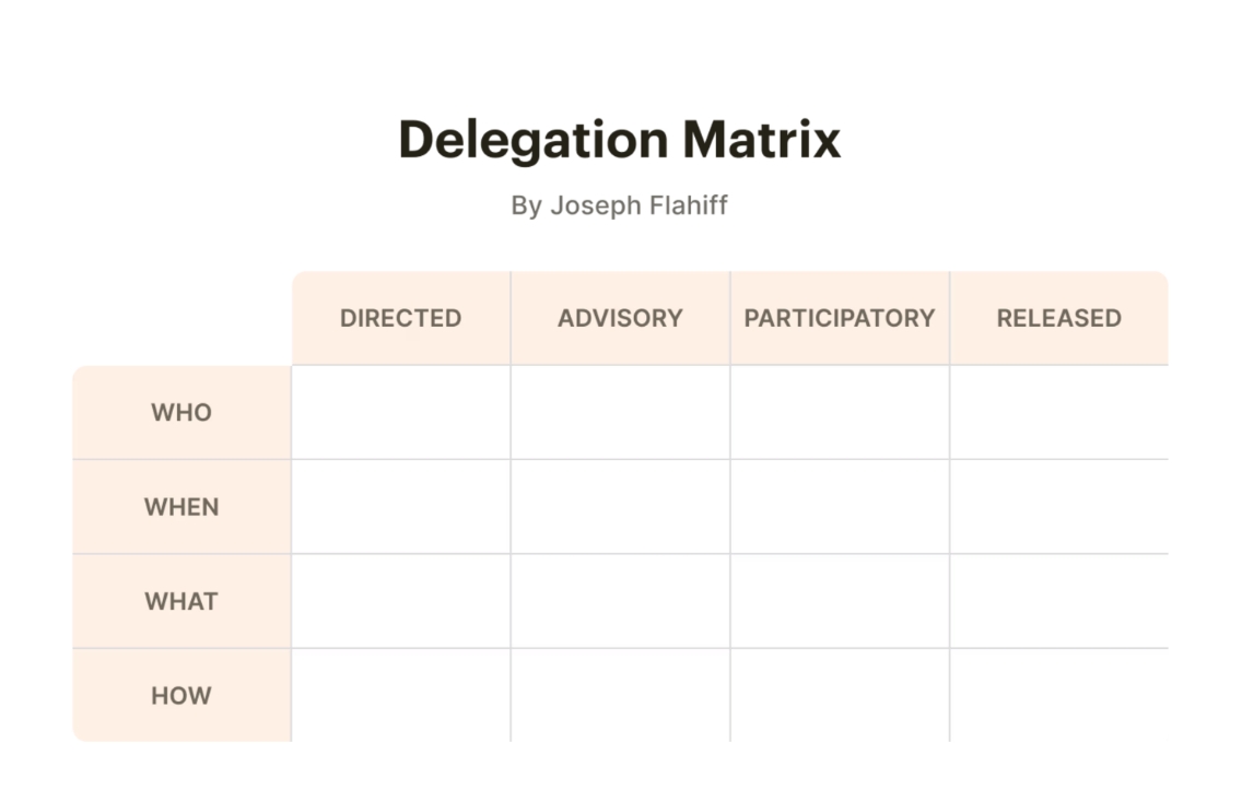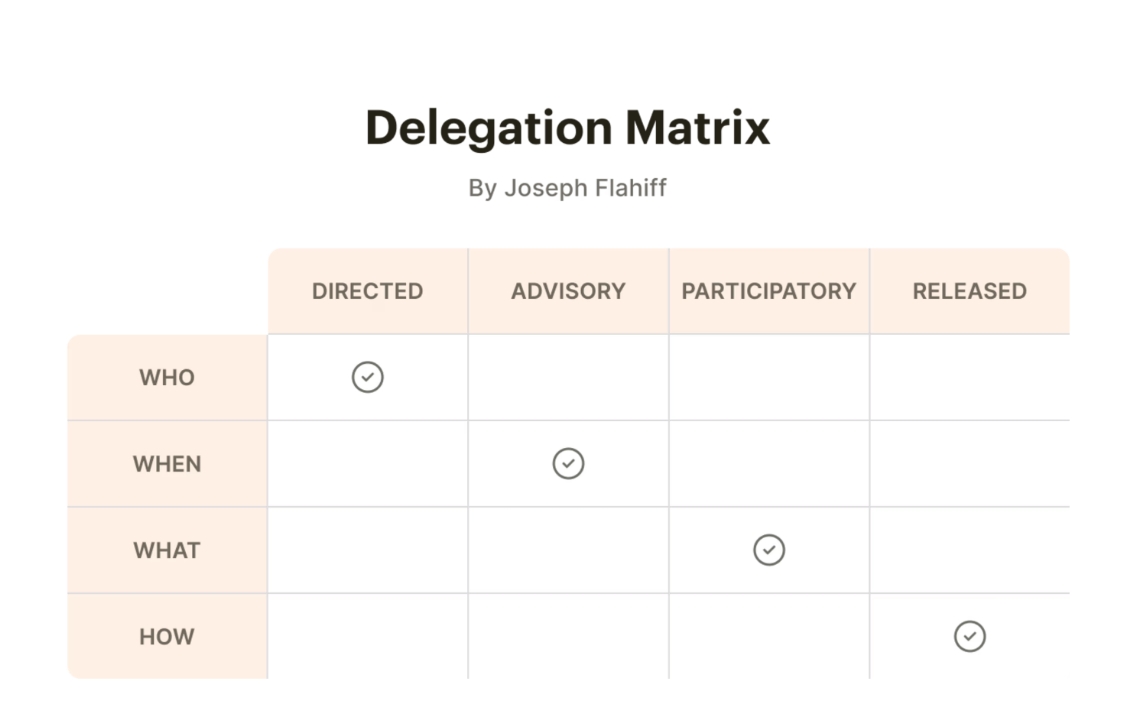 Flahiff 矩阵非常适合于将项目全部委派给责任级别不一的大型团队的领导者。你还可以运用到权限和责任分配不均匀,并且你需要更细致的信息来做出决定的任务上。