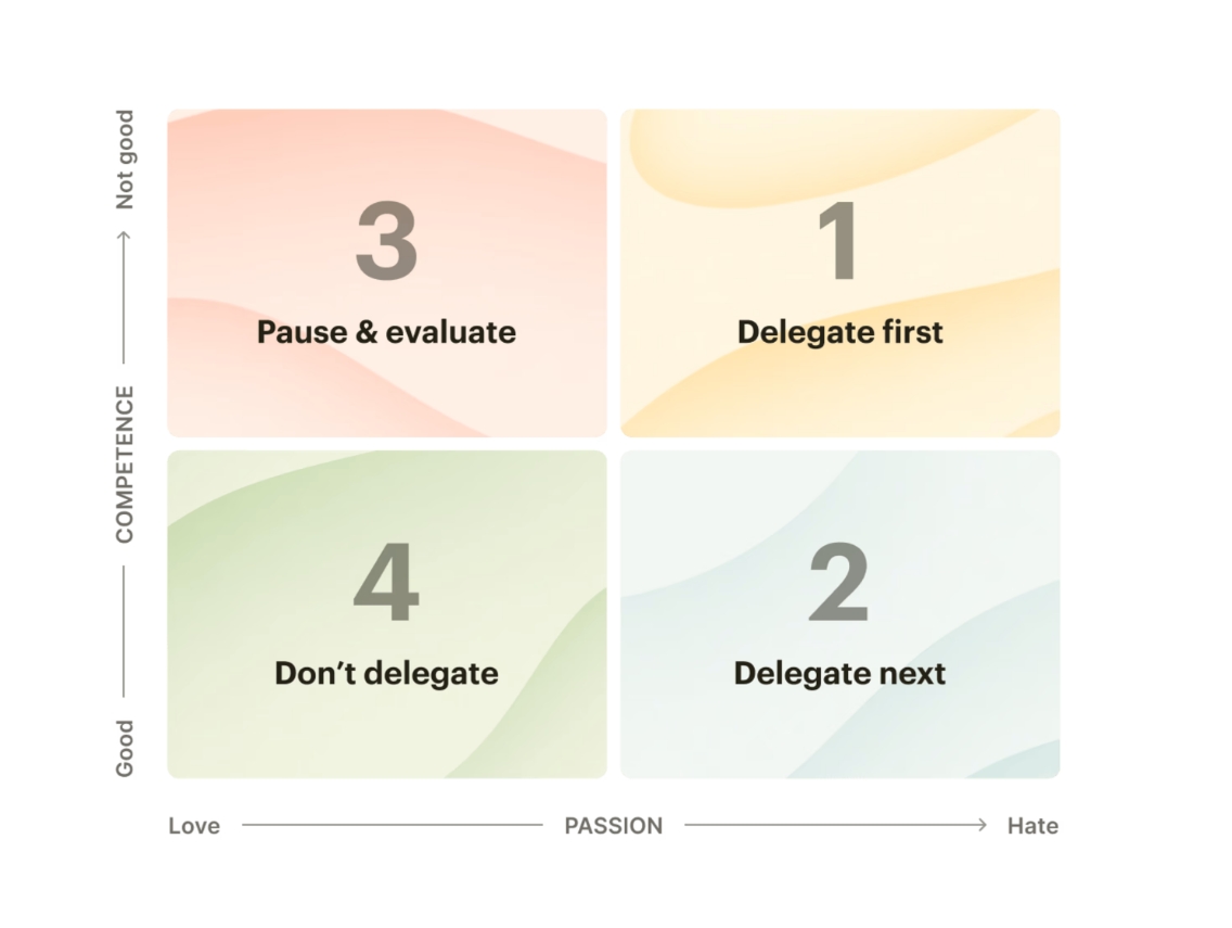 一旦你知道了哪些任务不能委派出去之后,你就会得到一份可以委派出去的任务清单。但你不能一次性地把所有这些任务都交出去。为此,激情-能力委派矩阵可以派上用场,帮助你了解应该从什么地方开始。