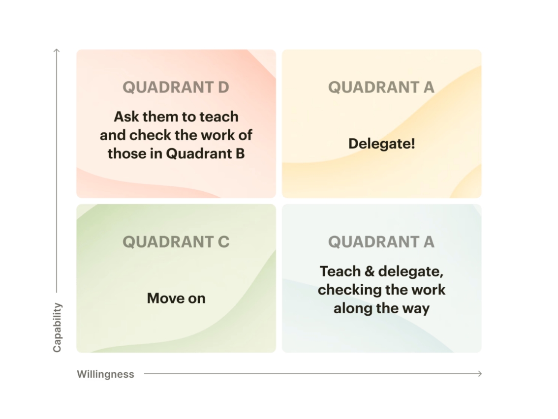 意愿高,能力弱:如果你要把工作委派给渴望学习但尚不具备此项工作技能的人时,请做好心理准备,你得从头开始培训他们,并全程予以支持。这个象限的最佳任务是你想要长期外包出去的重复性职责。