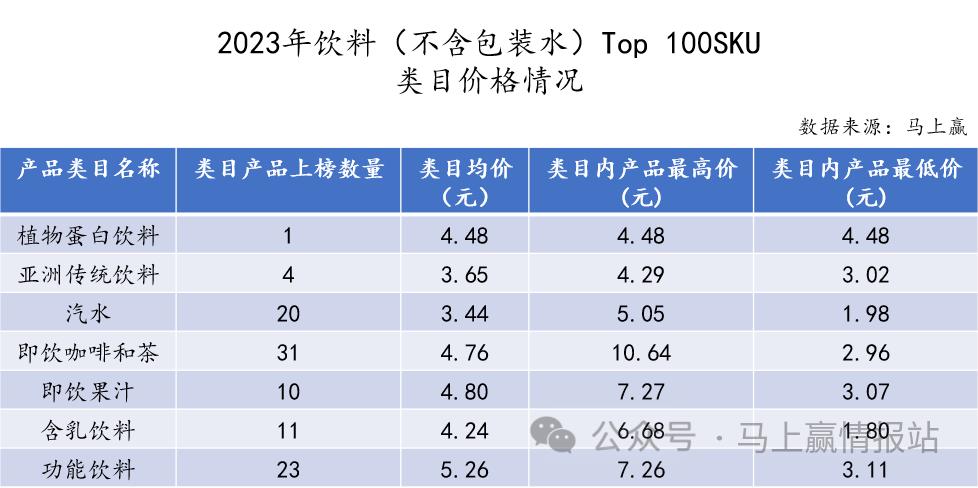 在Top 100饮料SKU中,我们也以类目维度进行了价格情况的梳理:
