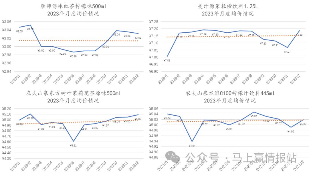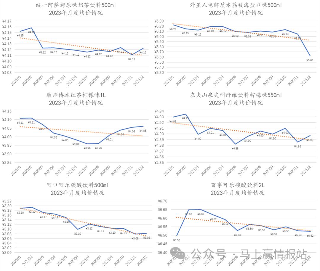 饮料是否越来越贵,我们同样通过热点单品的均价数据进行说明。基于马上赢线下零售监测网络中的相关数据,我们拉取了即饮奶茶、即饮茶、碳酸饮料、运动饮料、非冷藏即饮果汁几个类目中市场份额位于前列的几款产品在2023年的月度均价变化情况,以观察2023年年内,饮料整体价格的变动情况。
