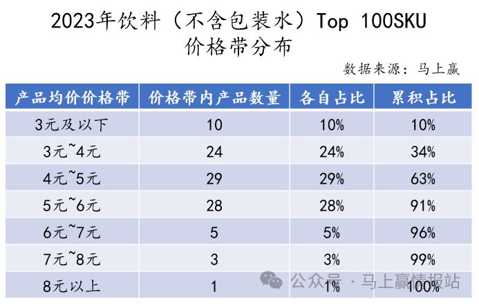 基于马上赢线下零售监测网络中的数据,我们拉取了2023年整年,全城市等级(县级及以上城市)、全业态,饮料类目(不含包装水、乳制品等)销售额Top100的SKU(600ml及以下规格、单件不包含套组、箱等组合包装形式),并通过其成交均价及所属类目,去管窥饮料整体价格带构成情况。