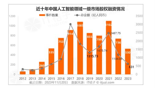说要AI创业的人很多,好的项目很少。这就造成了一种局面,说要投资AI的人很多,出手的项目却很少。2023年初,一部分基金热烈讨论着“All-in AGI”,甚至有基金经理说,“让TMT组的同事也别东看西看了,就All-in AI吧。”结果到了年底看数据,到11月20日为止全年人工智能领域一级市场股权融资事件530起,比去年同比降低27.99%;融资金额631亿元,同比降低46.7%。