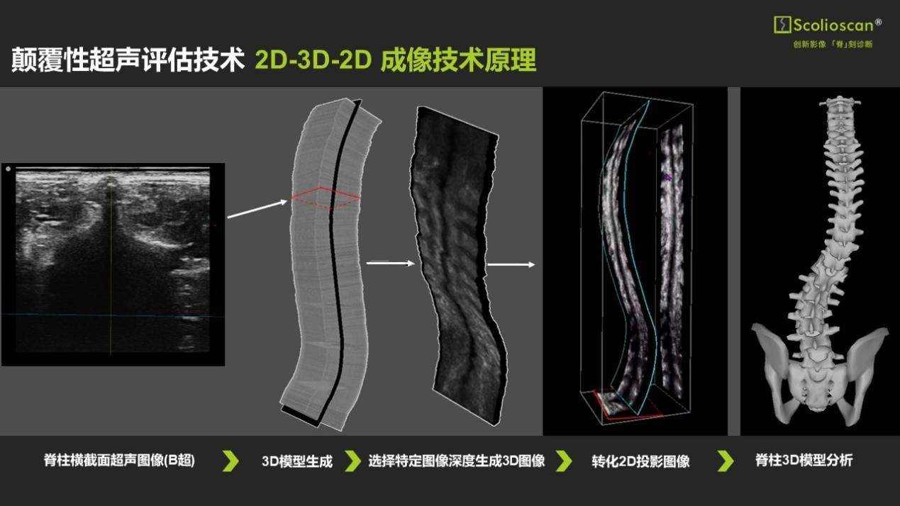 脊柱三维超声成像技术应运而生,填补现行技术空白,颠覆脊柱检测常规。它打破过去无法用超声看骨骼的局限,将可用于胎儿扫描的高安全系数超声波与人工智能算法、空间定位技术相融合,基于B超图像以及每张图对应的立体空间信息进行三维图像重建,实时获取骨骼变形、骨表面形态、肌肉及其它软组织的图像信息。[4][5]