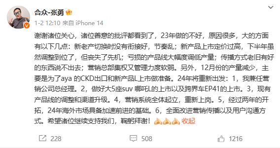 在社交平台,哪吒CEO张勇复盘了过去一年,诚恳地表示各方批评均收到,2023年做得不好,原因有很多:“新老产(品)切换没有衔接好、节奏乱;新品上市定价过高,下半年虽然调整到位,但丧失了先机;亏损的产品线大幅度调低产量;传播方式老旧,有好的东西说不出去。”2024年,哪吒将进一步调整产品线和营销端,张勇已亲自挂帅营销业务。