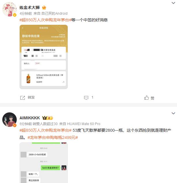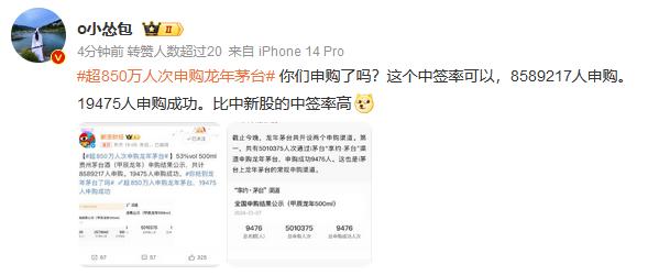 在微博平台上,关于“龙茅”的讨论热度飙升。有网友直接列出了详细数据:8589217人申购,19475人申购成功。比中新股的中签率高。