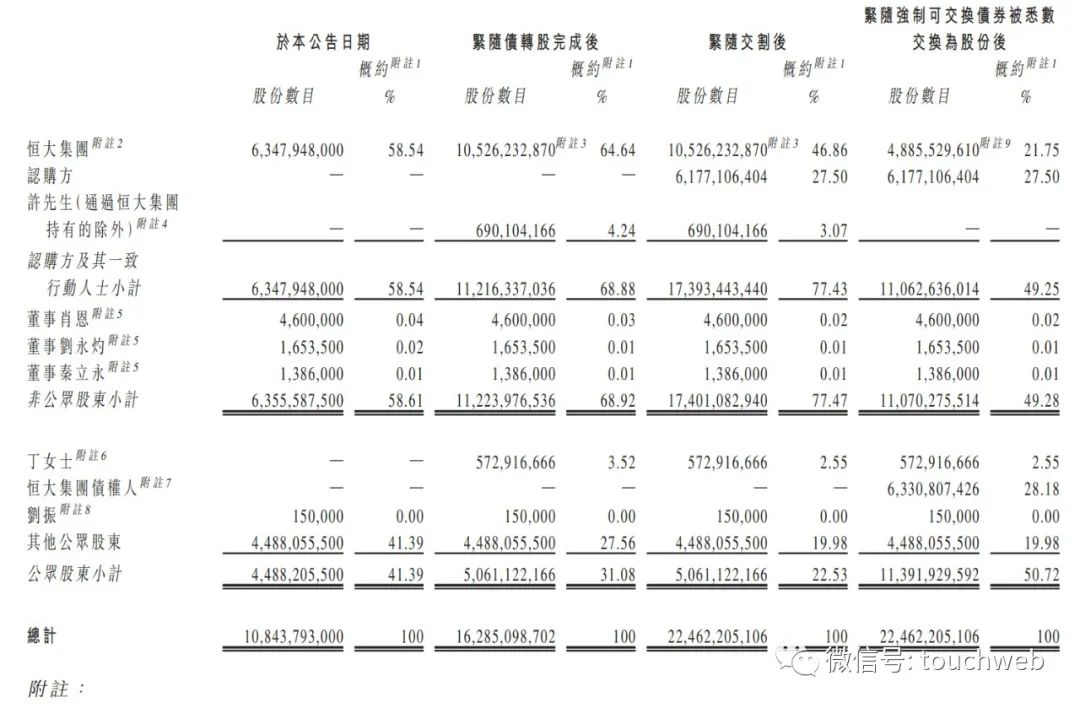2023年8月14日(交易时段后),恒大汽车发布公告,称已有条件同意配发及发行,而认购方已有条件同意认购认购股份(即6,177,106,404股新股份),致使认购方在债转股及股份认购事项完成后,持有恒大汽车因发行股份而经扩大后的已发行股份总数约27.5%。