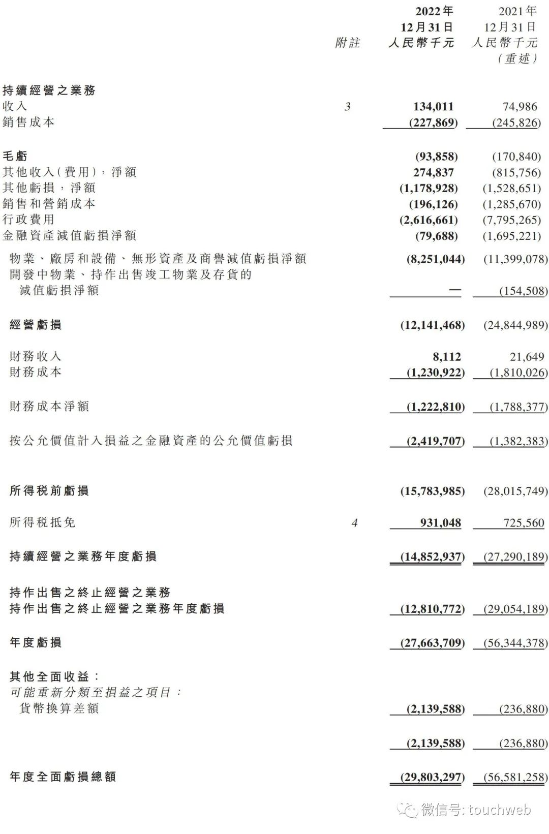 财报显示,恒大汽车2021年、2022年营收分别为7498万元、1.34亿元;毛亏损分别为1.7亿元、9386万元。